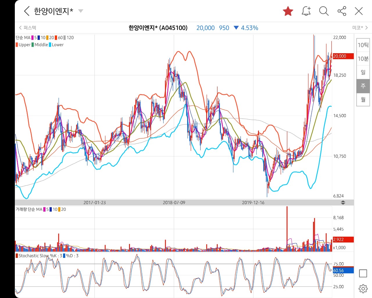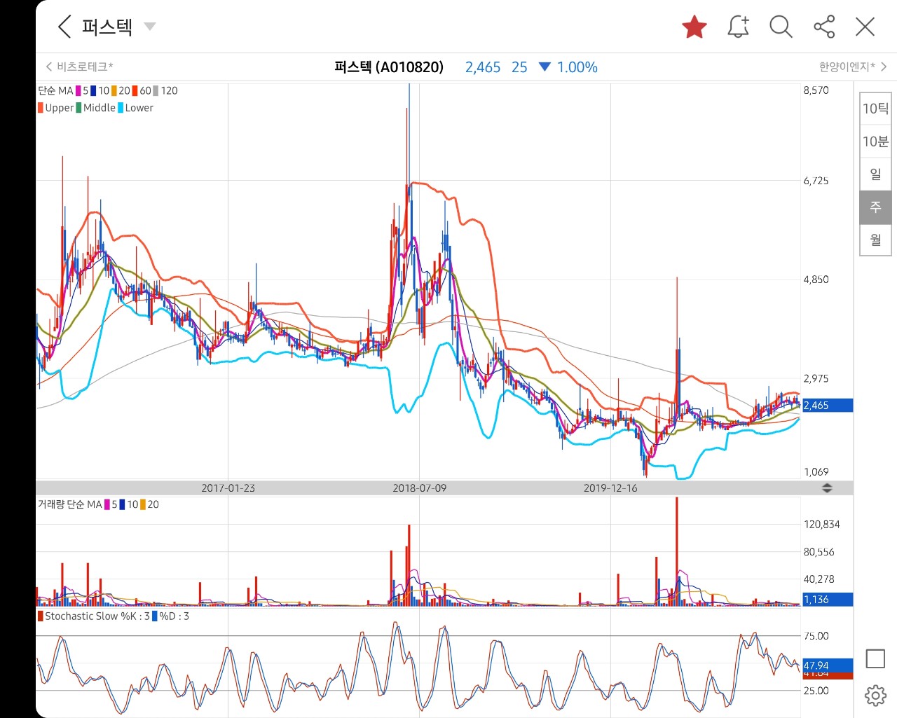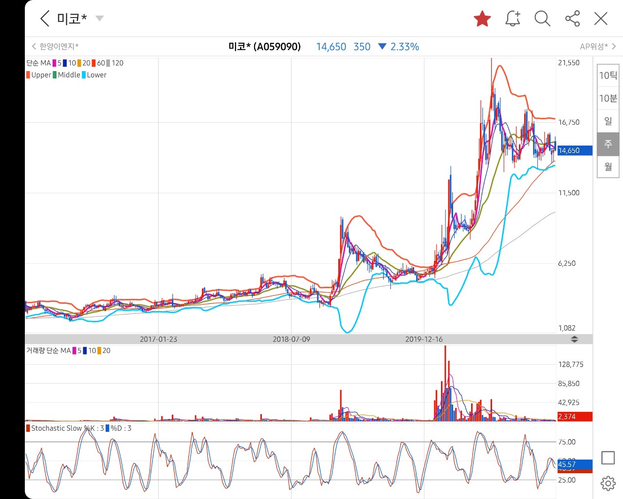 주봉차트 상 저점을 찍고 상승 중인 흐름을 보여주고 있습니다.