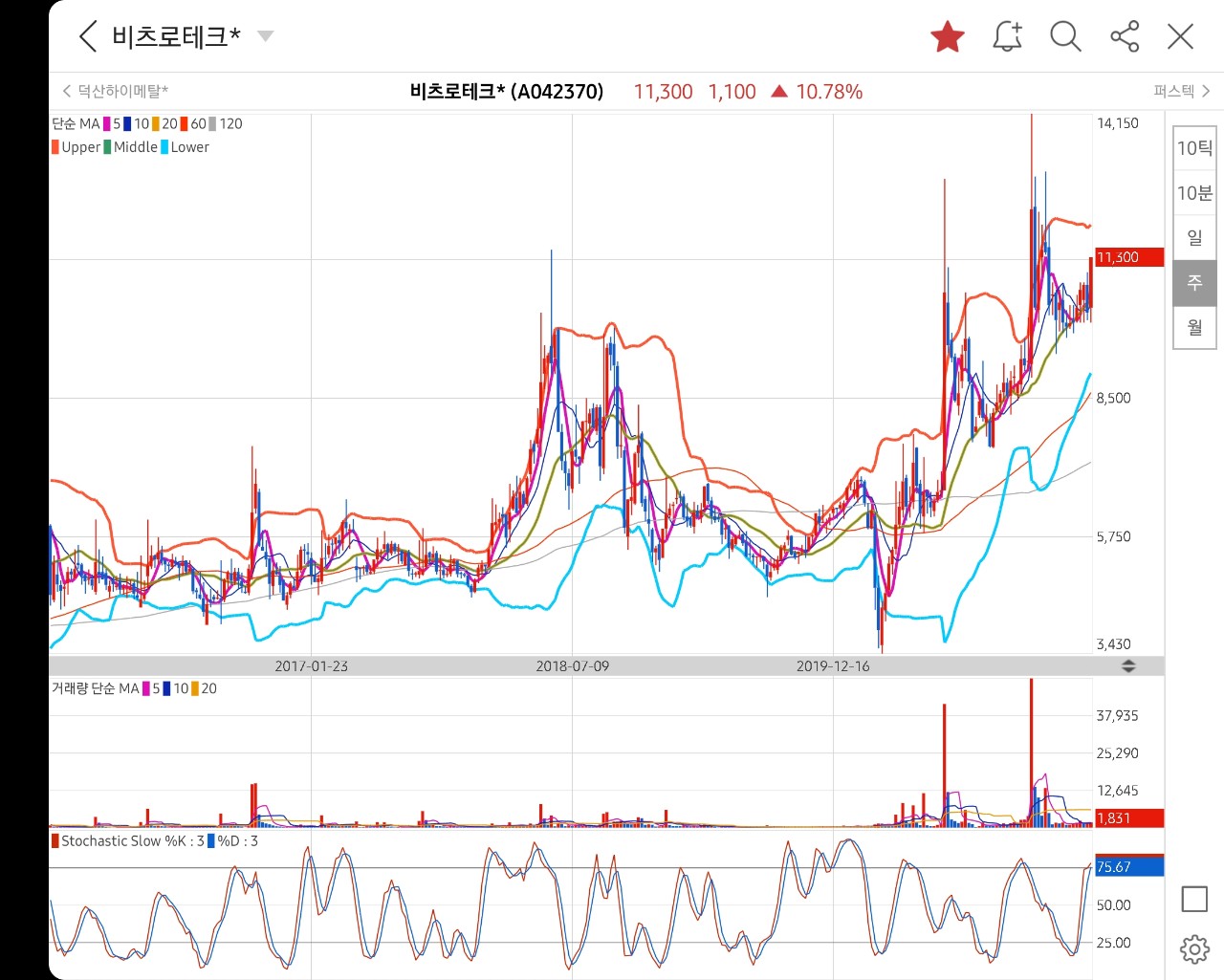 주봉차트 상으로 우상향으로 시세 분출 패턴으로 파악됨.