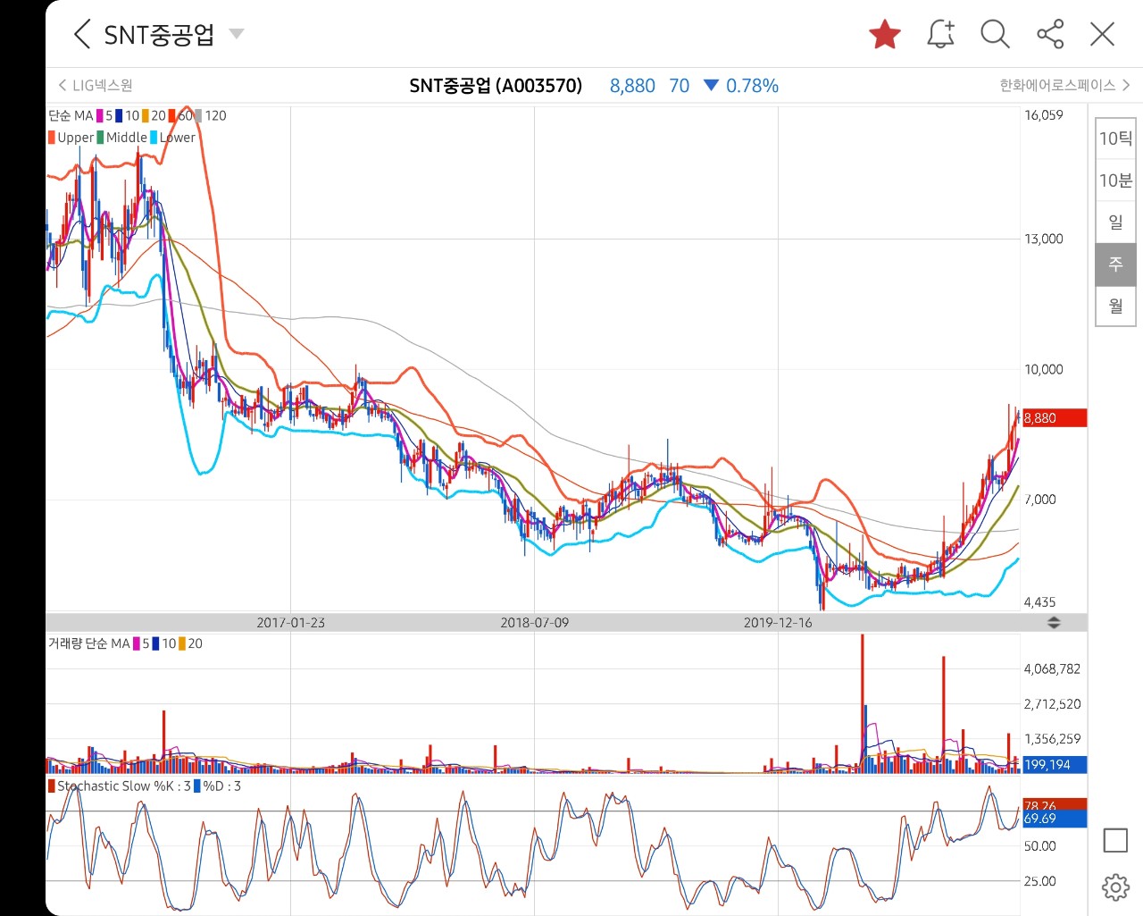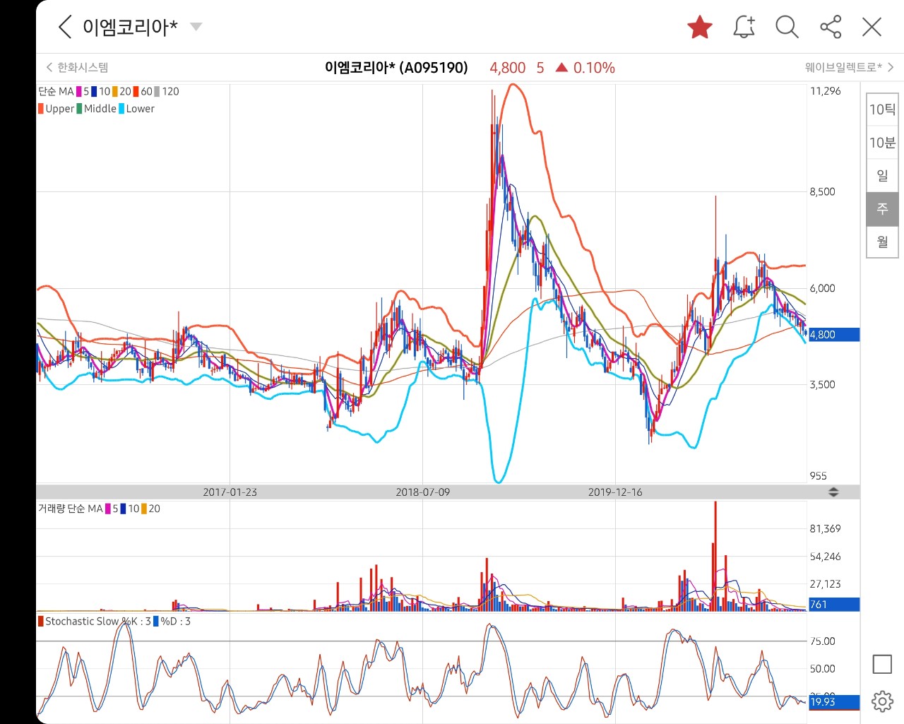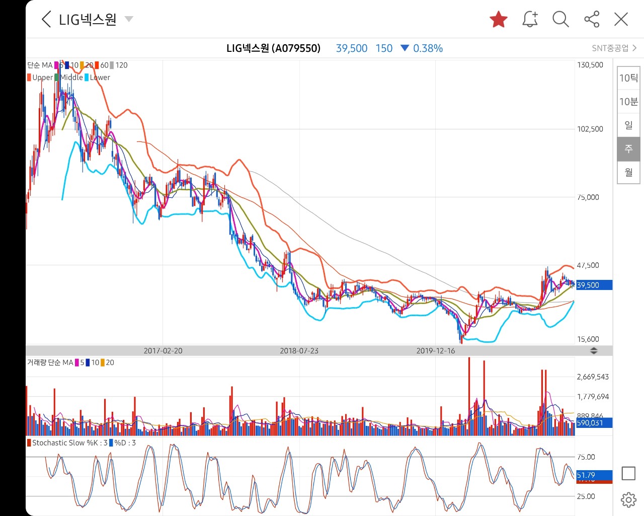 주봉차트 상 저점을 찍고 상승 중인 흐름을 보여주고 있습니다.