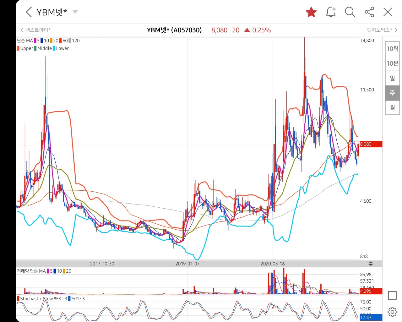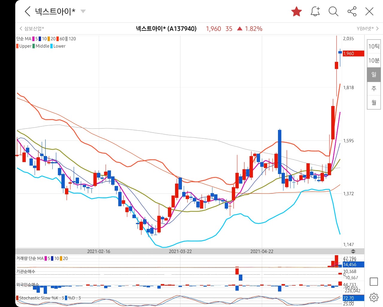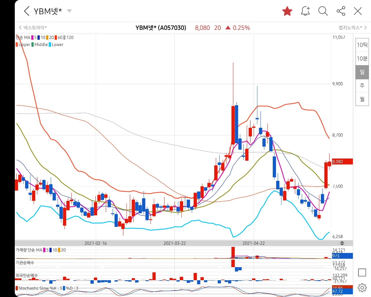 넥스트아이의 주가도 1,450원대 주가가 5월 21일부터 급등하여 5월26일 현재 2,000원대를 넘보고 있습니다. YBM넷의 주도 5월25일 14%대의 급등세를 보여주었습니다.