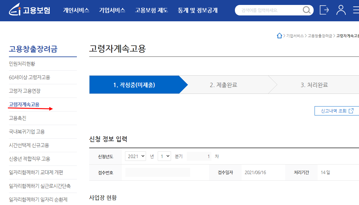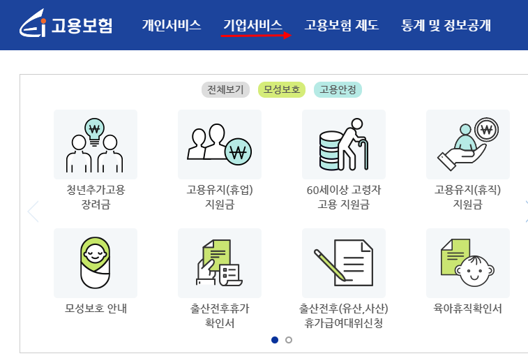 고용노동부 홈페이지 상단 기업 서비스 → 고령자 계속고용 클릭