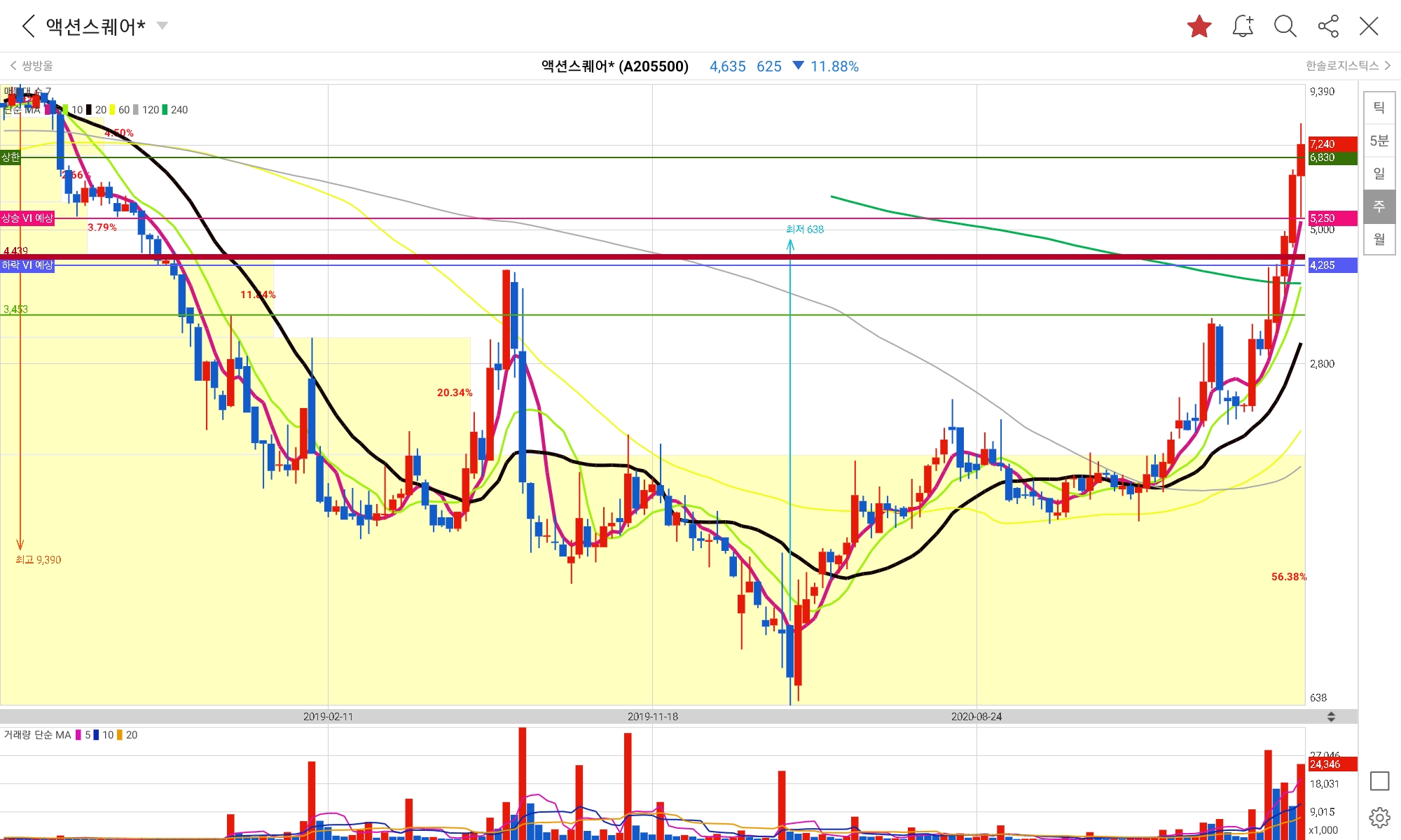6월 8일 8,040원의 고점을 찍은 액션스퀘어 주가가 6월 18일 현재(12:02PM, 4,670원) 단기 급락 중입니다. 6월15일 대량의 거래량 5,829,000주가 터졌지만 -17.97% 하락으로 마감한 뒤, 현재까지 하락세가 지속되고 있습니다.