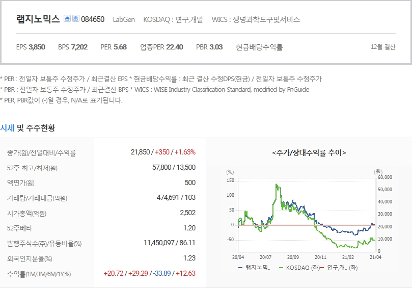 랩지노믹스 재무상태 및 주가